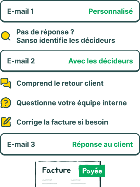 Sanso relance au bon moment, par le bon canal, avec le bon ton. Il se coordonne avec vos équipes, modifie et renvoie la facture si nécessaire.